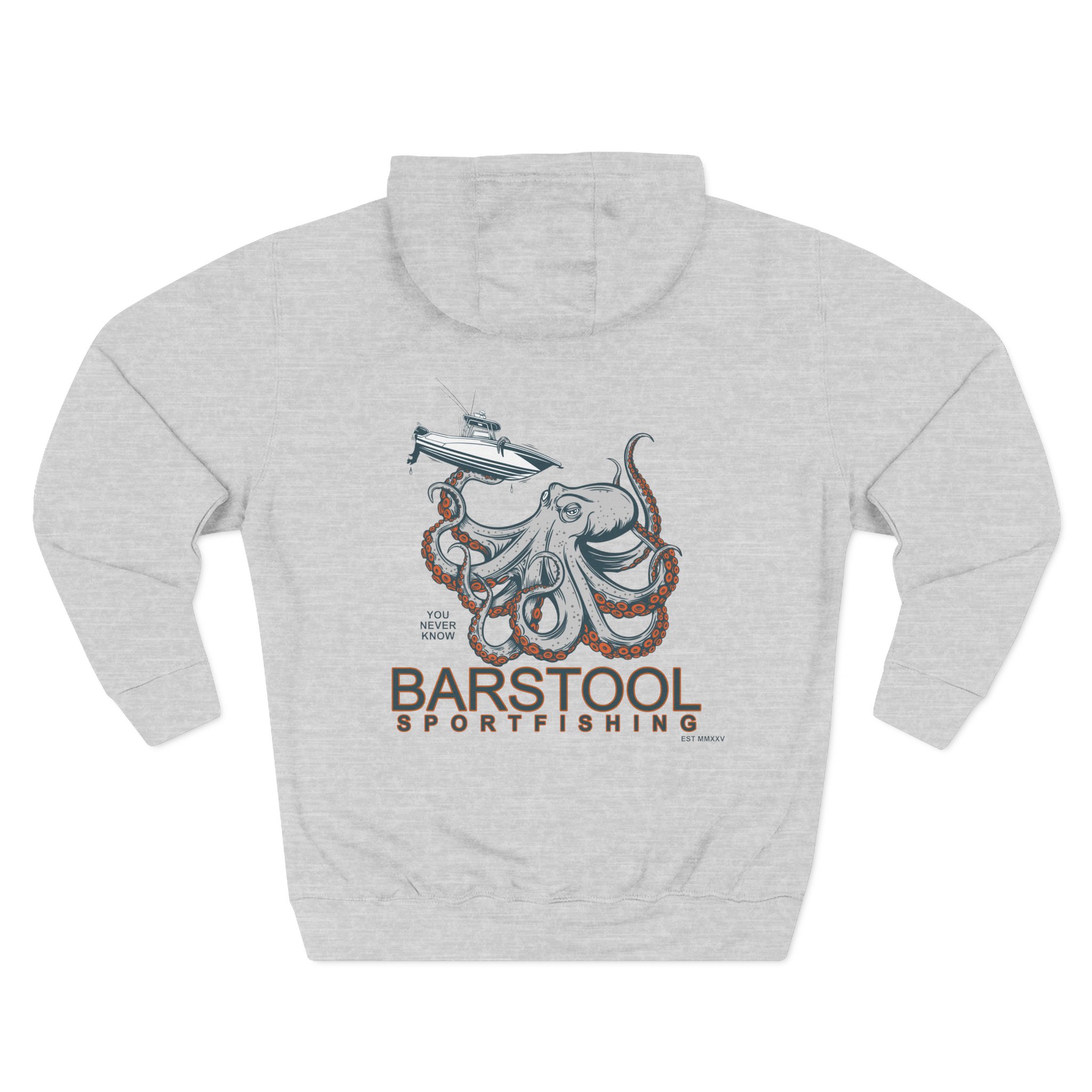 This cozy hoodie carries the slow, salty rhythm of the sea. Mid-weight fleece and a roomy kangaroo pocket make it a go-to layer for early-morning launches, dockside banter, and long rides home after a day on the water. The embroidered logo or bold back print of an octopus and sportfishing icon tells a quiet story of hands-on trips, tackle boxes, and conversations about the one that got away. It hugs the shoulders and keeps the chill out without feeling bulky — built to move with you and age into a favorite piece.